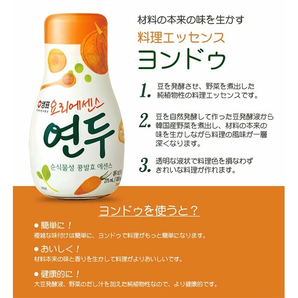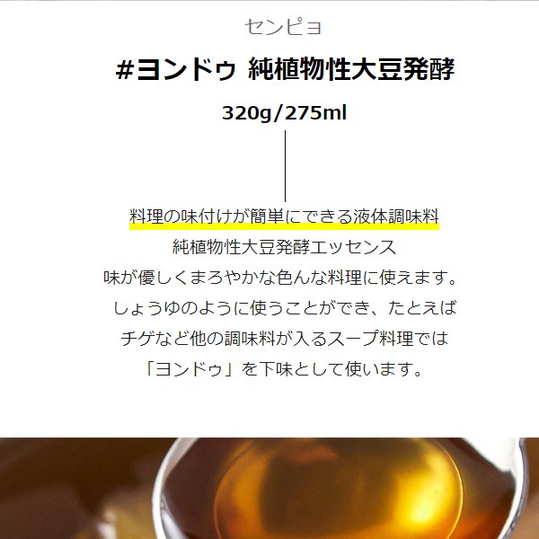 | 特徴 | 純植物性大豆発酵エッセンス、ヨンドゥ 韓国料理の味付けが簡単にできる液体調味料です。 センピョ ヨンドゥは、 味が優しくまろやかな色んな料理に使えます。 しょうゆのように使うことができ、たとえばチゲなど他の調味料が入るスープ料理では「ヨンドゥ」を下味として使います。 あっさりしたわかめスープや、ほうれん草のナムルを作るときなど材料本来の味と香りを生かして料理がよりおいしいです。 一層風味を生かしてくれる純植物性液体調味料です。 |