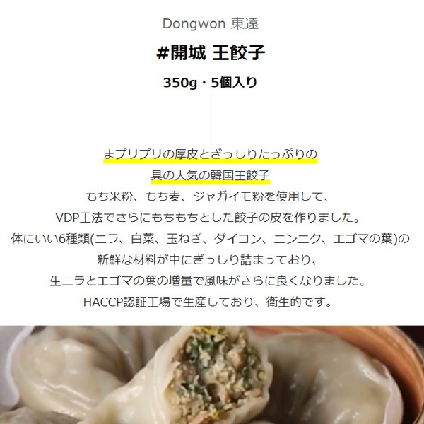 | 特徴 | まプリプリの厚皮とぎっしりたっぷりの具の人気の韓国王餃子 もち米粉、もち麦、ジャガイモ粉を使用して、 VDP工法でさらにもちもちとした餃子の皮を作りました。 体にいい6種類(ニラ、白菜、玉ねぎ、ダイコン、ニンニク、エゴマの葉)の 新鮮な材料が中にぎっしり詰まっており、 生ニラとエゴマの葉の増量で風味がさらに良くなりました。 HACCP認証工場で生産しており、衛生的です。 |