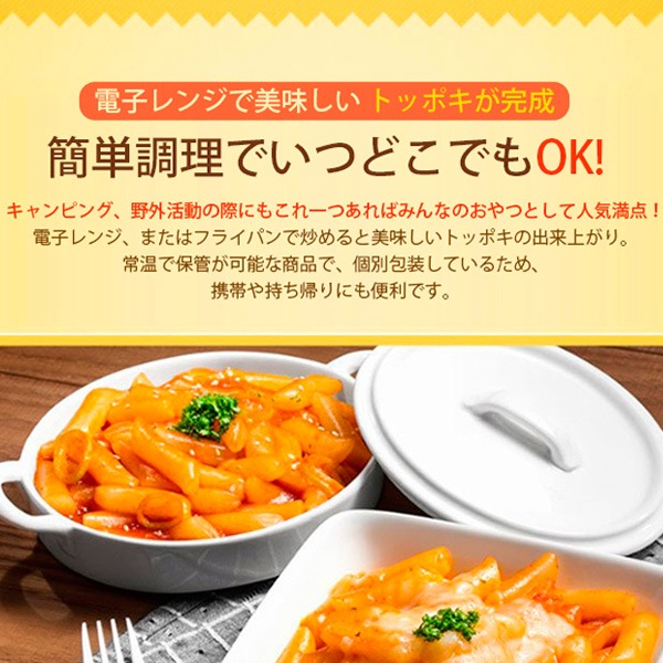 | 原材料 | トッポギ餅:米(アメリカ産)、食塩/ pH調整剤、酒精 ソース:水飴、砂糖、醤油(小麦・大豆含む)、コチュジャン(小麦、水飴、辛味調味ソース、唐辛子粉、食塩、もち米、大豆粉)、にんにく、玉ねぎ、調理酒、唐辛子、加工バター(乳脂肪、無脂乳固形分)、チキン風味粉末(鶏肉を含む)、ホエイパウダー(乳成分を含む)、でん粉、生姜、食塩、たん白加水分解物、シュガーシロップ、カレー粉、マルトデキストリン/調味料(アミノ酸等)、酒精、着色料(パプリカ色素、カラメル色素)、酵母エキス、増粘剤(キサンタンガム)、ビタミンB1、リン酸Ca、微粒二酸化ケイ素、香辛料抽出物、香料、クエン酸、乳化剤 |