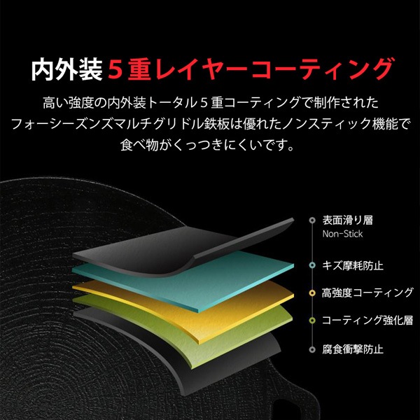 | 特徴 | 鉄板マルチグリドルの魅力あるデザインと機能性 韓国で有名な大手メーカーLACENAのマルチグリドルです(正規品) 1.焦げ付きにくいからお手入れがとても簡単。 2.イノーブルコーティングという加工を施しているため焦げ付きにくく、調理後はサッと拭き取るだけで大丈夫。 3.さらに、錆びることもなく、シーズニングも必要ないのでお手入れがとても簡単です。 4.ガスコンロや焚火台での直火調理はもちろん、底部中央に磁性体を配しており各種IHにも対応しています。 5.錆・傷に強く、耐摩耗性にすぐれた高級硬質特殊フッ素樹脂加工「イノーブルコーティング」を使用。 6.高い強度の内外装トータル5重コーティングで制作されたフォーシーズンズマルチグリドル鉄板は優れたノンスティック機能で食べ物がくっつきにくいです。 |