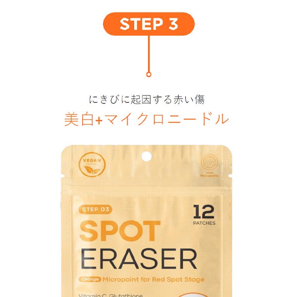 | 特徴 | スポットイレイザーオレンジSTEP3 スポッホワイトニング成分で構成されたマイクロニードルがにきびのために発生した赤い傷跡ホワイトニング 美白+マイクロ二ドル |