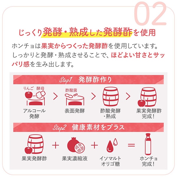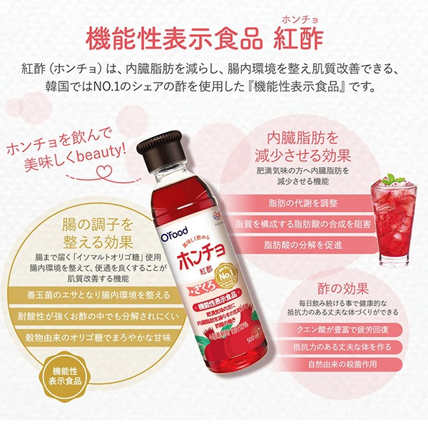 | 特徴 | ホンチョは、発酵酢から作られた果実のお酢。ほどよい甘さでサッパリと飲みやすく仕上げています。 韓国「ビネガードリンク市場」で11年連続売上No.1 お酢の効果で、カラダの内側からいきいきと。 ホンチョがあれば忙しい日々も乗り越えられる。 さあ、あなたも疲れ知らずの、キレイ生活をはじめましょう! 内臓脂肪を減らすのを助ける酢酸の働き ホンチョは果実からつくった発酵酢を使用しています。 しっかりと発酵・熟成させることで、ほどよい甘さとサッパリ感を生み出します。 |