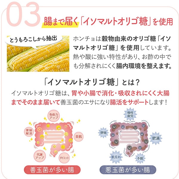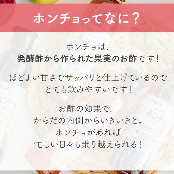 | 特徴 | ホンチョは、発酵酢から作られた果実のお酢。ほどよい甘さでサッパリと飲みやすく仕上げています。 韓国「ビネガードリンク市場」で11年連続売上No.1 お酢の効果で、カラダの内側からいきいきと。 ホンチョがあれば忙しい日々も乗り越えられる。 さあ、あなたも疲れ知らずの、キレイ生活をはじめましょう! 内臓脂肪を減らすのを助ける酢酸の働き ホンチョは果実からつくった発酵酢を使用しています。 しっかりと発酵・熟成させることで、ほどよい甘さとサッパリ感を生み出します。 |