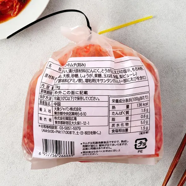 | 主原料 | はくさい、だいこん、漬け原材料(とうがらし、えびの塩辛、にんにく、もち米、水飴、梨ピューレ、しょうが、果糖、玉ねぎ、食塩、砂糖)、調味料(アミノ酸)、増粘剤(キタサンガム) |