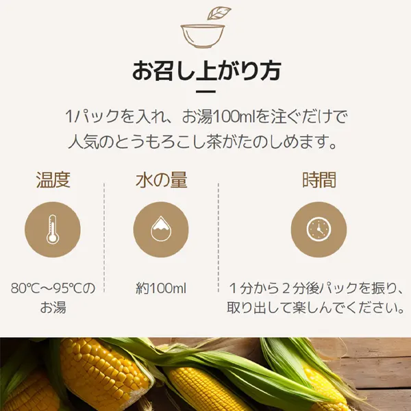 | 美味しい召し上がり方 | ・温かいトウモロコシひげ茶 ティーバッグ1個(1.5g)に対して熱湯(約100ml)を注いで、1~2分充分に蒸らしてからお召し上がりください。 ・クールトウモロコシひげ茶 ティーバッグ1個(1.5g)に対して冷水(約100ml)を注いで、1~2分充分に蒸らしてからお召し上がりください。 ※お好みで氷を加えて涼しくお楽しみください。 |
