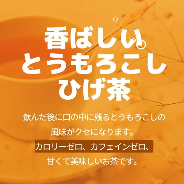 | 特徴 | 香ばしいとうもろこしひげ茶をお手軽に楽しめます。 飲んだ後に口の中に残るとうもろこしの風味がクセになります。 カロリーゼロ、カフェインゼロ、甘くて美味しいお茶です。 |