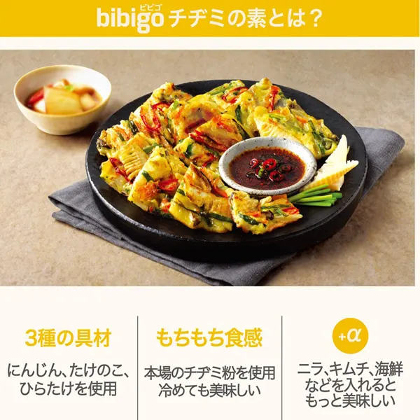 | 特徴 | 簡単!水いらず!チヂミ粉と具材を混ぜて焼くだけ! 3種類(人参・たけのこ・ひらたけ)の具材と粉、特製のたれをセットにし、チヂミ粉と具材を混ぜて焼くだけで簡単に韓国本場のチヂミが楽しめる製品です。 bibigoならではのもちもち食感がお楽しみいただけます。 |