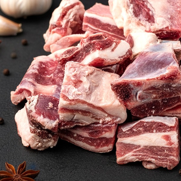 マトンで、骨が付いた状態のものです。 骨付きなので、いい出汁も出てシチューやスープ、煮込み料理に最適です。 赤身と脂身のバランスが良く、適度な霜降りになっており、柔らかくジューシーな肉質が特徴です。 クセが少なく食べやすい部位とされています。 インドやパキスタンの本格的なカレーに使われることが多く、骨周りの肉から溶け出す旨みが味の決め手になります。 骨付きのマトン(羊肉)の角切りは、骨から出る旨みが料理全体に深みを与え、カレーや煮込み料理に最適です。 |