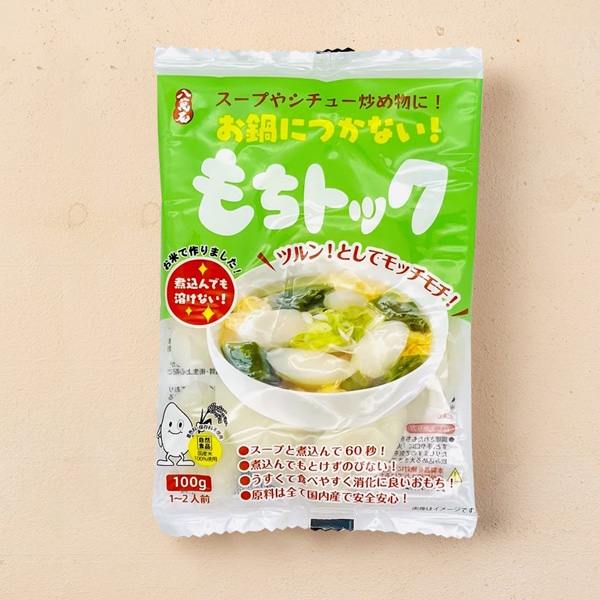 | 栄養成分表示:100g当たり | ●もち トッポギ : エネルギー234kcal / 炭水化物 52.9g / たんぱく質 3.9g / 食塩相当量 0.7g / 脂質 0.7g ●もち トック:エネルギー217kcal / 炭水化物 49g / たんぱく質 3.9g / 食塩相当量 0.6g / 脂質 0.7g ●星の形のおもち:エネルギー187kcal / 炭水化物 42.3g / たんぱく質 3.1g / 食塩相当量 0.6g / 脂質 0.6g |