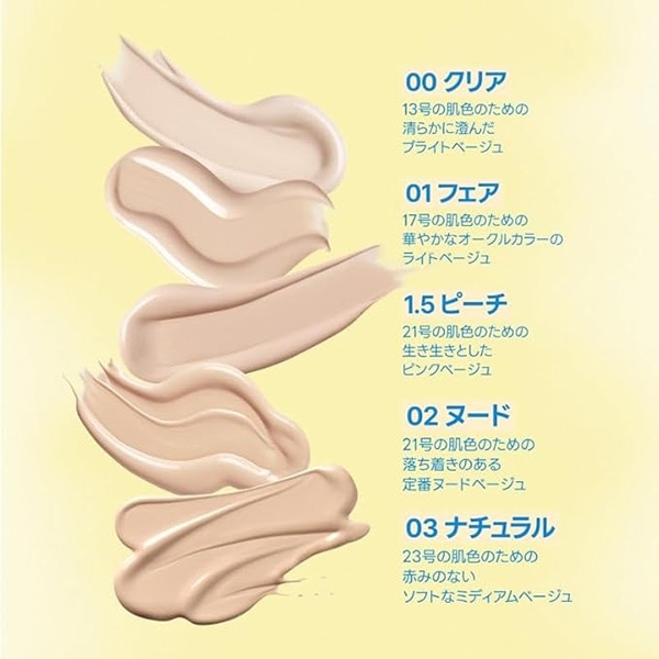 | カラー | 00号 クリア 01号 フェア 1.5号 ピーチ 02号 ヌード 03号 ナチュラル |