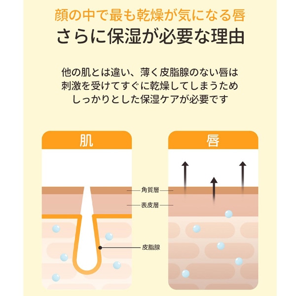| 特徴 | 1本3役!リップケアはこれ1本で解決! 日中のリップケアやグロスとしての使用はもちろん、気になる唇の角質ケア、スリーピングパックとしても使用可能。 目的毎に複数のリップも持たずとも、1本で解決します! べたつかないのにしっかり保湿!ほどよい厚みで使用感 5種類のセラミド,4種類のオーガニックオイル、シアバターを配合し、しっかりと保湿ケアをしつつもべたつかない使用感。 ほどよい厚みで唇を覆い、うるおいバリアを強化します。 角質ケア成分配合でざらつきオフ |