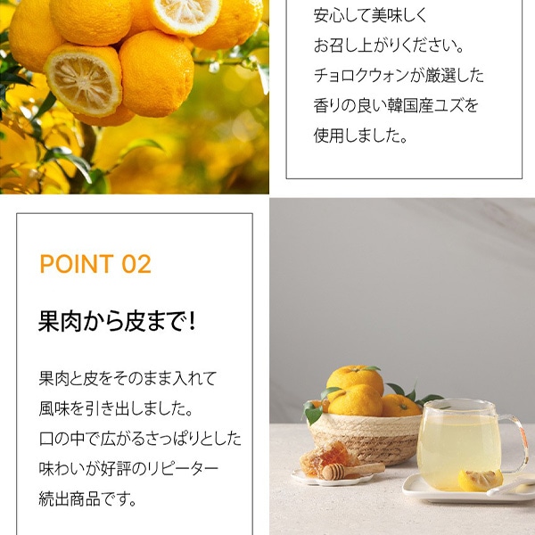 | 商品情報 | ※韓国有数の柚子の産地である高興(ゴフン)産の柚子を使用した栄養と香りが豊かな柚子茶です。 | ||