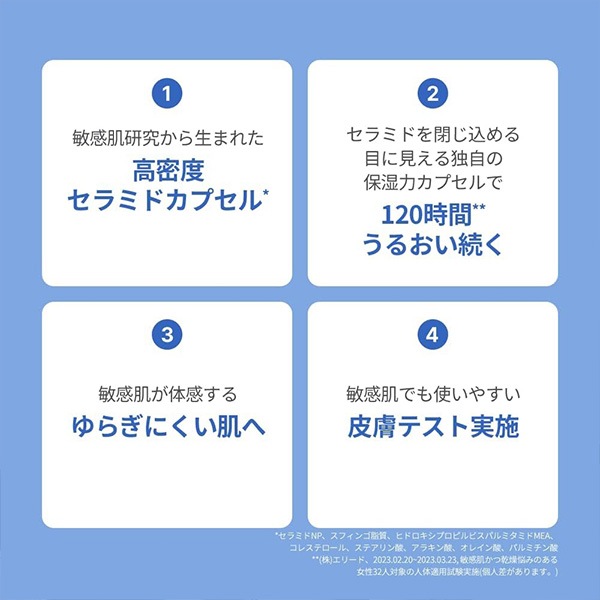 | 特徴 | 高密度セラミドカプセル:敏感肌研究40年から生まれた高密度セラミドカプセルをクリーム1本80mLに約100万個配合。 塗った瞬間カプセルが体温で柔らかく溶けて角質層すみずみまで満たし、肌のうるおいバリアをサポートします。 120時間うるおいが持続する保湿力:敏感肌に特に不足している高密度なセラミドと、 コレステロールや脂肪酸といった肌にある脂質の同一成分を配合することで、セラミド単体よりも角質層になじみやすく長時間うるおいをキープします。 敏感肌でも使いやすい:刺激に敏感な状態の肌でも使用できるように開発された商品で、 乳幼児から大人まで全ての年齢の方がお使いいただけます。 5つの皮膚テスト |