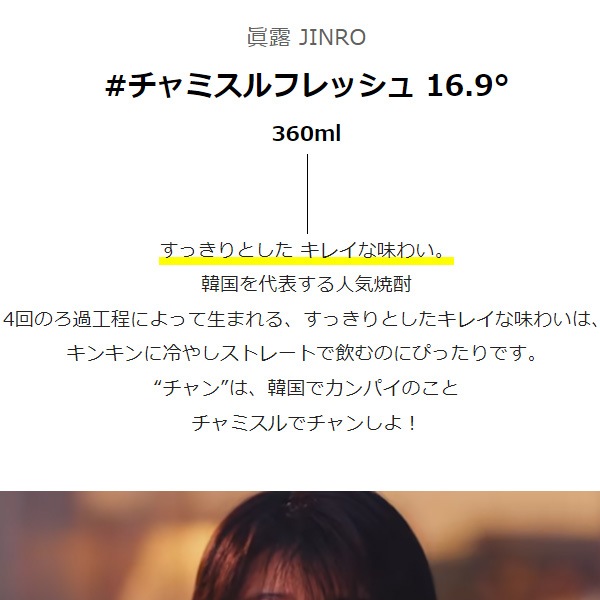 | 商品情報 | ※韓国を代表する人気焼酎ですっきりとした キレイな味わい。 | ||