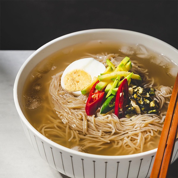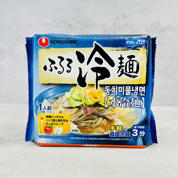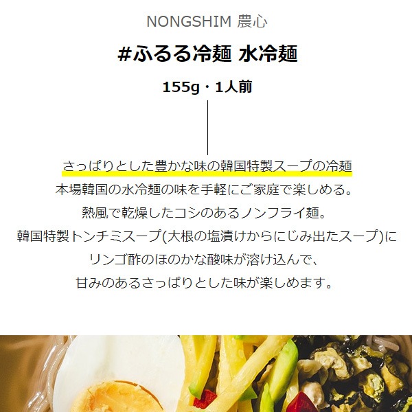 | 特徴 | 熱風で乾燥したコシのあるノンフライ麺。 韓国特製トンチミスープ(大根の塩漬けからにじみ出たスープ)にリンゴ酢のほのかな酸味が溶け込んで、甘みのあるさっぱりとした味が楽しめます。 |