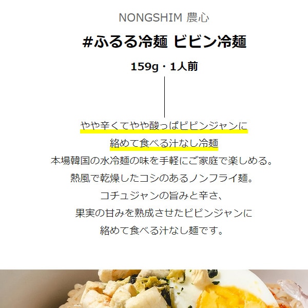 | 特徴 | 熱風で乾燥したコシのあるノンフライ麺。 コチュジャンの旨みと辛さ、果実の甘みを熟成させたビビンジャンに絡めて食べる汁なし麺です。 |