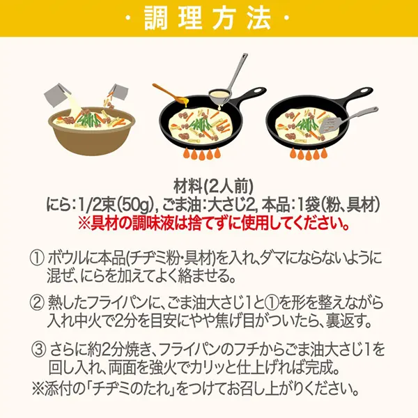 | 主原料 | 具材入り調味料[人参、たけのこ、ひらたけ、蛋白加水分解物、アサリエキス、食塩、イカエキス、ホタテエキス/調味料(アミノ酸)、酸化防止剤(ビタミンC)]、チヂミ専用粉[小麦粉、食塩、砂糖、とうもろこしでん粉、にんにく、たまねぎ、胡椒/ベーキングパウダー、増粘剤(キサンタンガム)、着色料(ビタミンB2)]、チヂミのたれ[しょうゆ、りんご酢、アミノ酸液、砂糖、魚醤、ガーリックエキス、にんにく、長ねぎ、水あめ、食塩、ぶどう糖、唐辛子/調味料(アミノ酸等)、酸味料、増粘剤(キサンタンガム)]、(一部に小麦、いか、さけ、大豆、りんごを含む) |