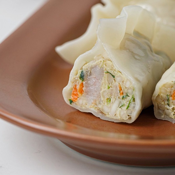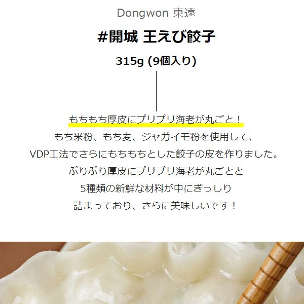 | 特徴 | もち米粉、もち麦、ジャガイモ粉を使用して、 VDP工法でさらにもちもちとした餃子の皮を作りました。 ぷりぷり厚皮にプリプリ海老が丸ごとと5種類(ニラ、にんじん、キャベツ、玉ねぎ、マッシュルーム)の新鮮な材料が中にぎっしり詰まっており、さらに美味しいです! HACCP認証工場で生産しており、衛生的です。 |