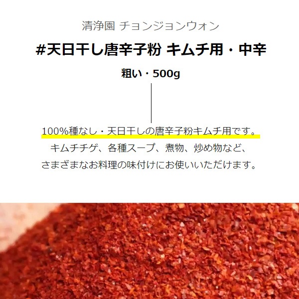 [清浄園] 天日干し 唐辛子粉 キムチ用・中辛(粗い・500g) / 調味料 韓国食材 韓国唐辛子 キムチ材料