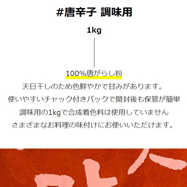 | 特徴 | 100%唐がらし粉 天日干しのため色鮮やかで甘みがあります。 使いやすいチャック付きパックで開封後も保管が簡単 調味用の1kgで合成着色料は使用していません さまざまなお料理の味付けにお使いいただけます。 |