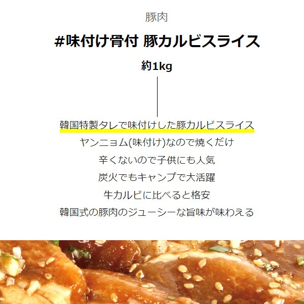 | 特徴 | 韓国特製タレで味付けした豚カルビスライス ヤンニョム(味付け)なので焼くだけ 辛くないので子供にも人気 炭火でもキャンプで大活躍 牛カルビに比べると格安 韓国式の豚肉のジューシーな旨味が味わえる テジガルビ・煮込み・サムギョプサルとして調理できます。 |