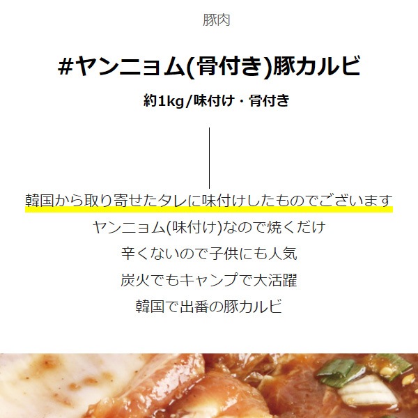 | 特徴 | 韓国から取り寄せたタレに味付けしたものでございます ヤンニョム(味付け)なので焼くだけ 辛くないので子供にも人気 炭火でもキャンプで大活躍 韓国で出番の豚カルビ |