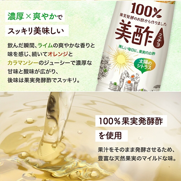 | 特徴 | 太陽の恵みを受けて育ったライム、オレンジ、カラマンシーの3種のシトラスを使用し、フルーティーでありながらも後味はお酢の酸味が程よく重なりスッキリとお召し上がりいただけます。 果汁使用量を約2倍増量し、より果実味のある味わいに仕上げています。(美酢グレープフルーツ900mLと比較し、約2倍増量。) 水や牛乳等で、お好みの濃さに割ってお召し上がりください。 おすすめは、ミチョ+炭酸水=ミチョソーダ! |