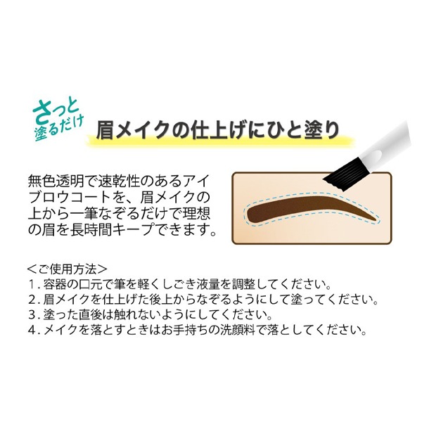 | 使用方法 | 1.容器の口元で筆をかるくしごき液量を調整してください。 2.眉メイクを仕上げた後上からなぞるようにして塗ってください。 3.塗った直後は触れないようにしてください。 4.メイクを落とすときはお手持ちの洗顔料で落としてください。 |