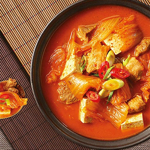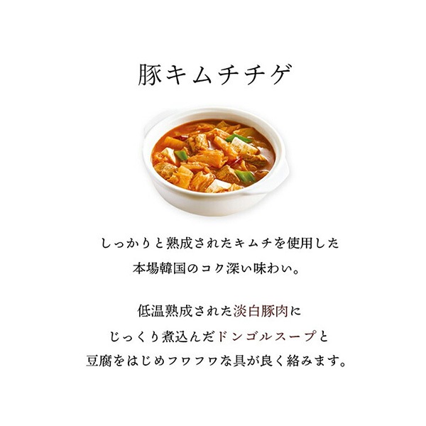 | 主原料 | 精製水、はくさいキムチ、豆腐、豚もも肉(韓国産)、長ねぎ、キムチエキス、豚脂、にんにく、ポークベース、唐辛子粉、青唐辛子、豚骨エキス、旨みペースト、複合調味食品、酵母エキス、豆もやしエキス、大豆油、唐辛子種油/調味料(アミノ酸等)、香辛料抽出物、乳酸Ca、硫酸Ca、グリセリン脂肪酸エステル、レシチン、甘味料(ステビア)、炭酸Mg、クエン酸、香料(一部に豚肉、牛肉、大豆、小麦を含む) |
