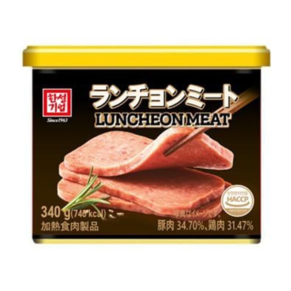 | 主原料 | 豚肉(韓国産)、鶏肉(韓国産)、とうもろこしでん粉、大豆たんぱく、砂糖、食塩、ランチョンミートシーズニング(マルトデキストリン、食塩、乳清粉末、にんにく、にんにくオイル、スモークオイル、砂糖、たまねぎ粉末)、小麦粉/調味料(アミノ酸等)、ポリリン酸Na、ビタミンC、香辛料抽出物、香料、クチナシ赤色素、発色剤(亜硝酸Na)、(一部に豚肉、鶏肉、大豆、乳、小麦を含む) |