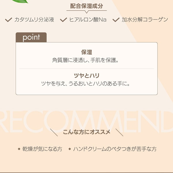 | 特徴 | カタツムリ分泌液(保湿成分)スキンケアシリーズ。 モイストモイスチャーハンド&ネイルクリーム。 手肌と爪のキューティクルをすこやかに保つハンドケアクリーム。 うるおいを与えながらも、ベタつきにくい使用感のウォータードロップタイプです。 手肌だけでなく、爪やキューティクルのケアにも使えます。 |
