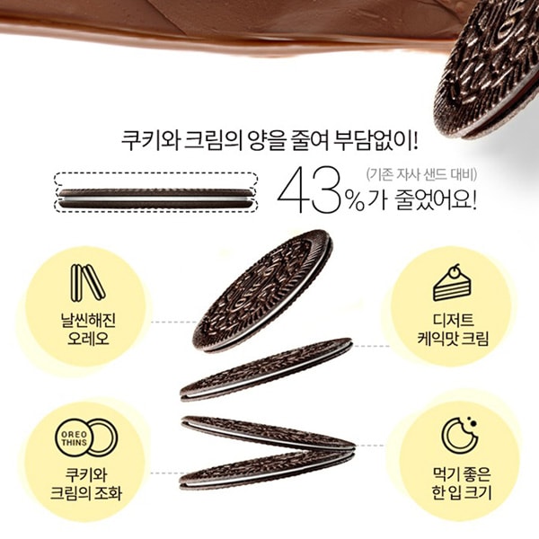 | 特徴 | 通常のオレオよりも薄く、サクサクとした軽い食感が特徴で、ほろ苦いココアビスケットと甘さ控えめのホワイトクリームのバランスが良い製品です なめらかでクリーミーなホワイトバニラ風味のクリームがサンドされており、甘すぎず、軽い口当たりです。 |
